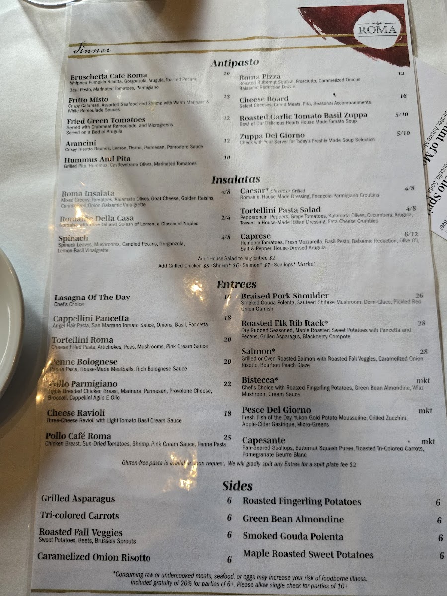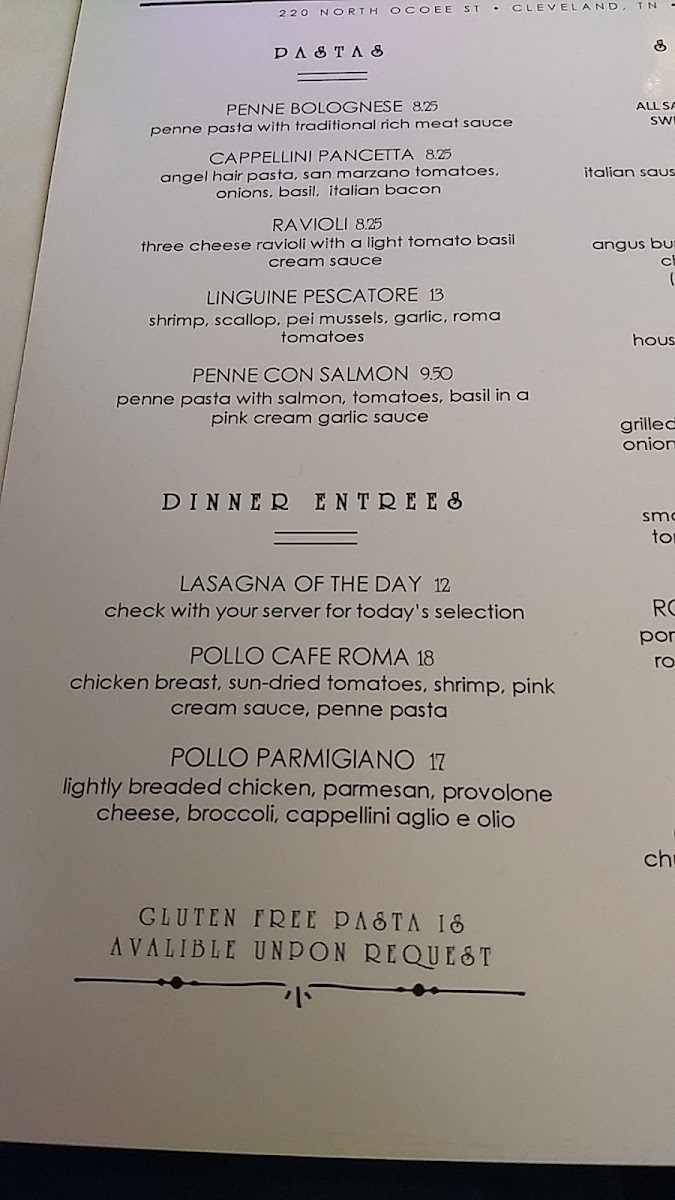 From a reviewer’s perspective, the menu at Cafe Roma, located at 220 N Ocoee St in Cleveland, Tennessee, delivers a well-rounded and thoughtfully curated Italian dining experience that balances familiarity with comfort. The lunch offerings such as BRUSCHETTA CAFE ROMA, FRITTO MISTO, CAPRESE, ROMA PIZZA, and ARANCINI set a strong foundation, showcasing classic Italian flavors that are simple yet inviting. As the menu transitions into dinner, the entrées elevate the experience with known favorites like LASAGNA OF THE DAY, CAPPELLINI PANCETTA, TORTELLINI ROMA, PENNE BOLOGNESE, and POLLO PARMIGIANO, reflecting a focus on hearty, satisfying dishes prepared in a traditional style. The dinner antipasti section mirrors this consistency, reintroducing crowd-pleasers such as BRUSCHETTA CAFE ROMA, FRITTO MISTO, CAPRESE, ARANCINI, and ROMA PIZZA, which are ideal for sharing and sampling. Freshness and balance come through in the insalata selections, including ARUGULA SALAD, ROMA INSALATA, SPINACH SALAD, CAESAR SALAD, and ROMAINE DELLA CASA, offering lighter options that complement the richer entrées. The sides, from HAND CUT FRIES and CUCUMBER TOMATO FETA SALAD to ISRAELI COUS COUS, ROASTED GARLIC MASHED POTATOES, and CRISPY POLENTA CAKES, add flexibility and depth to any meal. Finally, desserts such as TIRAMISU, CHOCOLATE-HAZELNUT MOLTEN CAKE, CHEESECAKE OF THE MOMENT, and CREME BRULEE provide a satisfying conclusion, reinforcing Cafe Roma’s commitment to classic Italian indulgence. Overall, the menu feels cohesive and reliable, making it easy for diners to enjoy a complete Italian meal from start to finish.