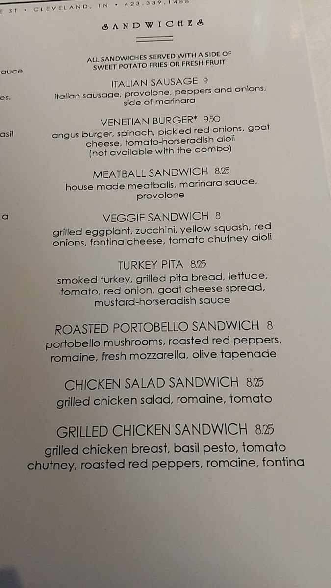 your choice of two: half any sandwich (excluding the venetian burger), half any salad, or a cup of soup